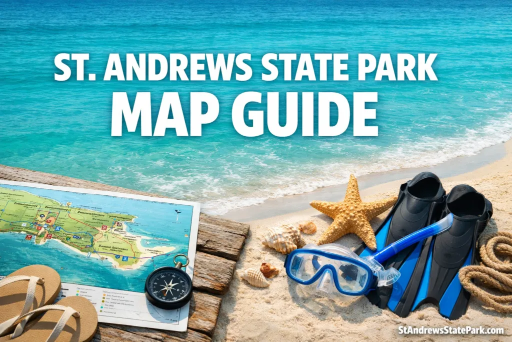 A St. Andrews State Park map is more than a visitor handout. It is the clearest way to understand how this park actually works on the ground: an entrance corridor, a Gulf-side beach zone, a lagoon-side boating zone, inland wetland trails, and a separate Shell Island inset that is part of the park but not road-connected to the mainland. Why do so many first-time visitors feel the park is larger than it looked online? Because the layout behaves less like one beach and more like a chain of connected coastal rooms. The official park information places public access at 4607 State Park Lane, with daily operation from 8 a.m. until sundown, so reading the map before arrival makes the whole visit feel far more intuitive.[a]