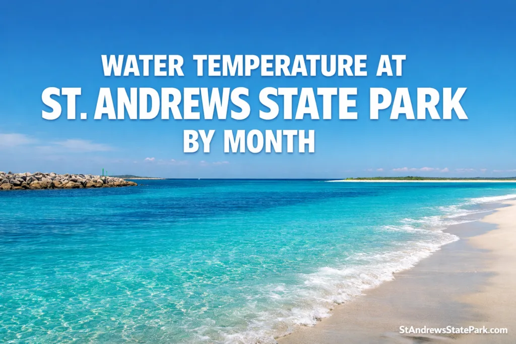 🌊 Data Note: The monthly figures below use official NOAA Panama City Beach water temperatures as the closest month-by-month benchmark for St. Andrews State Park. Inside the park, the open beach, the protected jetty zone, and the Grand Lagoon side can feel a little different on the same day because the park stretches across multiple shoreline settings.[a][c]